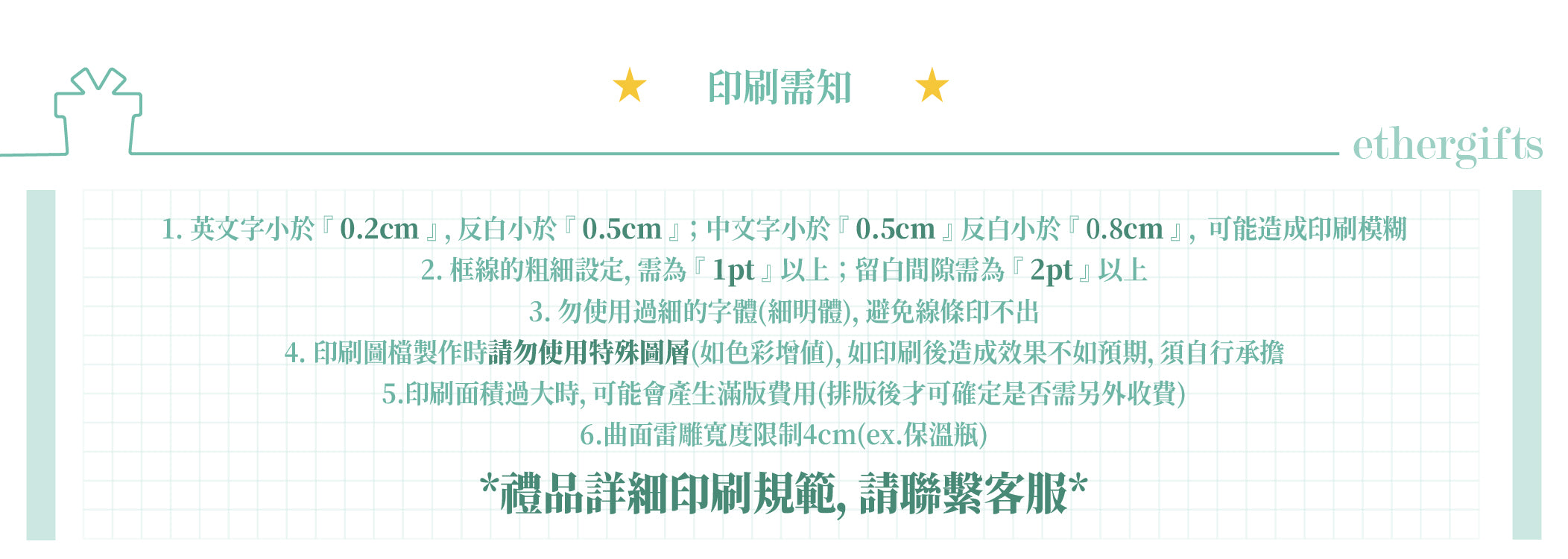 - 若印製之圖案或文字小於每單位5mm以下,會因其留白處越細小而另成品產生越明顯之誤差,客戶需自行交付調整好之印製檔案,以降低該成品之誤差現象。不得已此現象要求退貨退款。